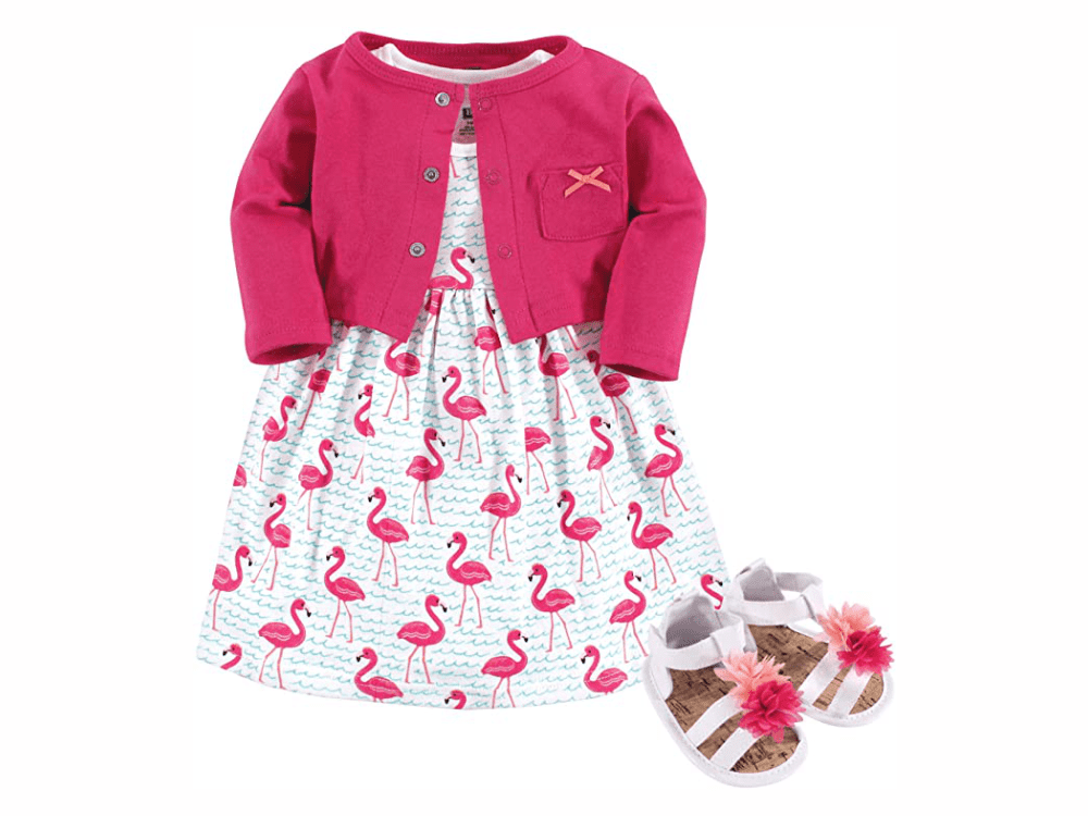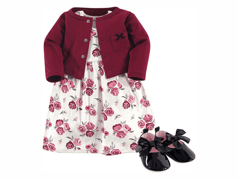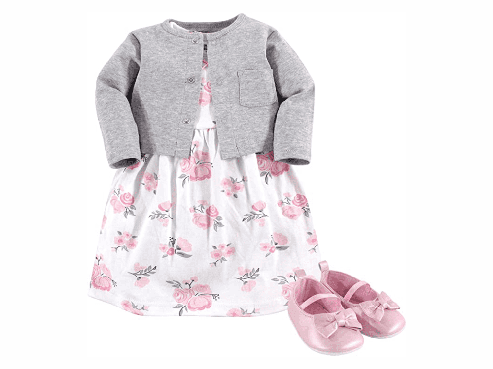 Dress, Cardigan and Shoe Set, Pink Gray Floral