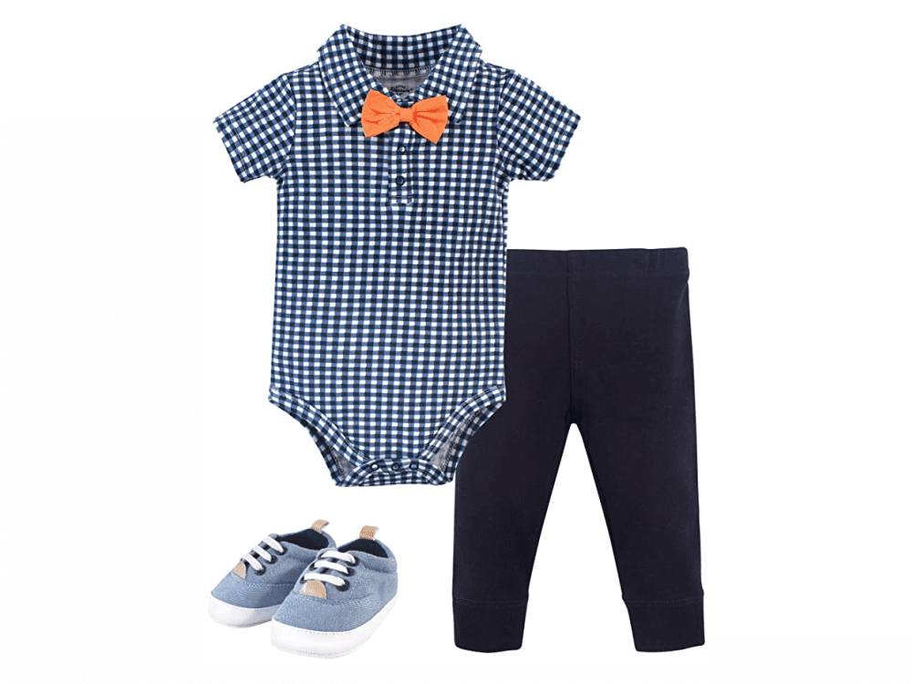 Cotton Bodysuit, Pant and Shoe Set, Checkered Collar