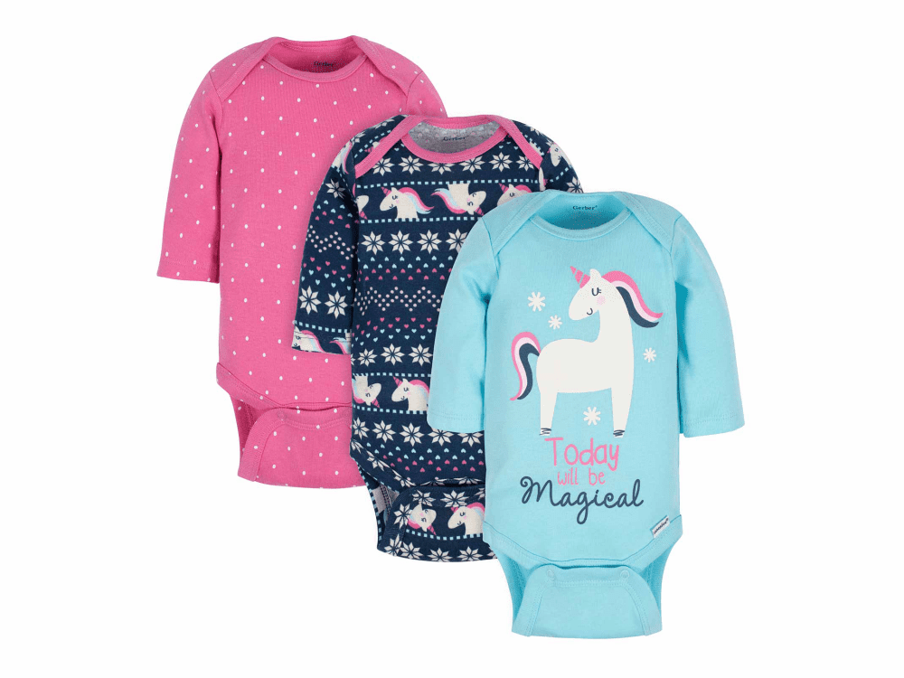 3-Pack Baby Girls Unicorn Long Sleeve Bodysuits
